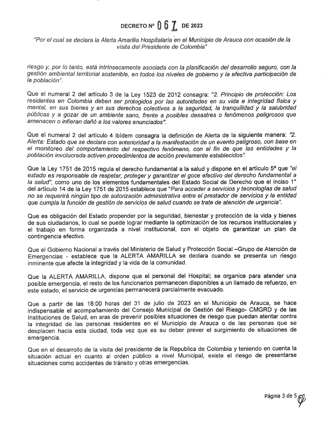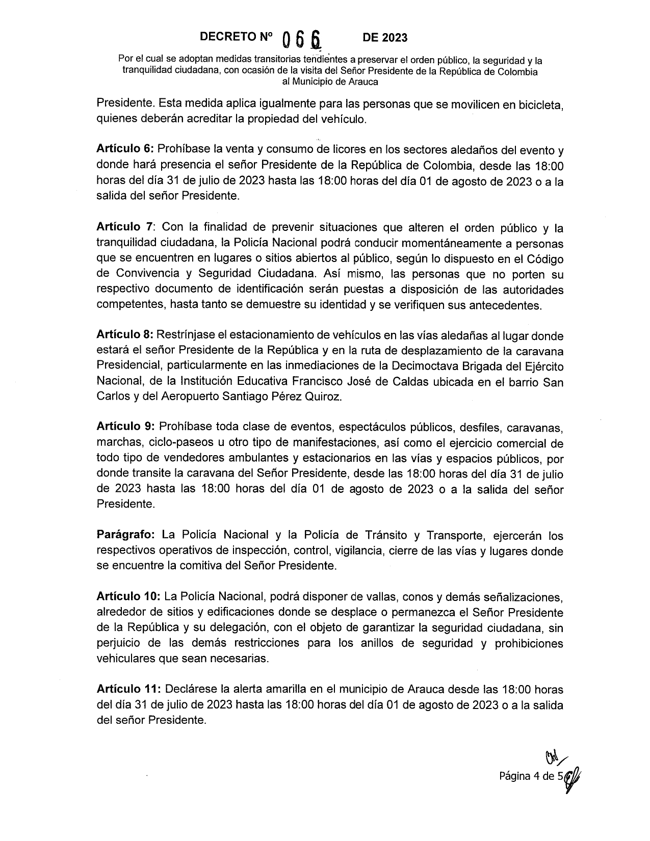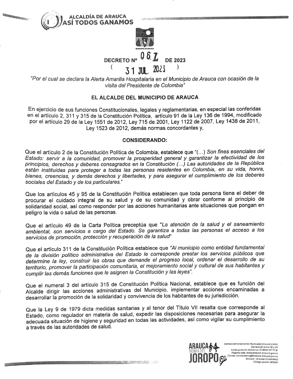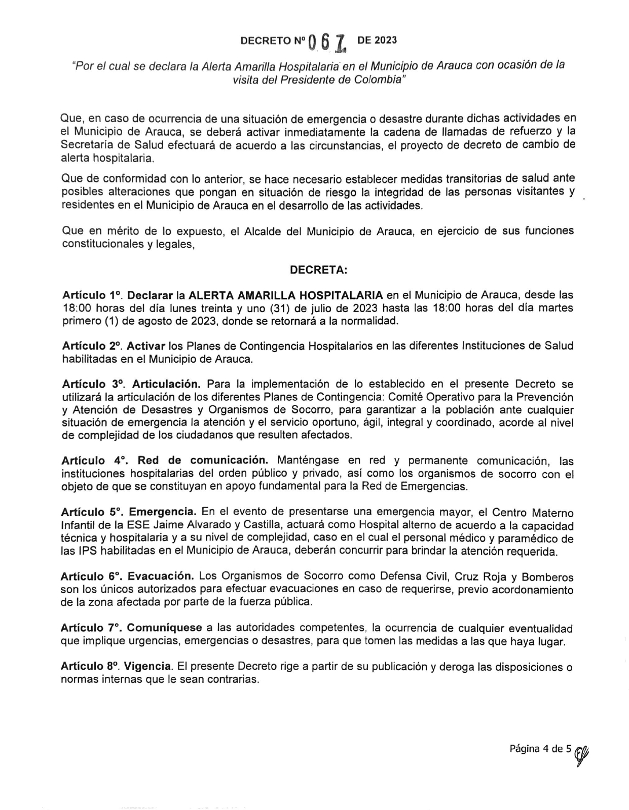 La alcaldía de Arauca tomó medidas tras la visita del presidente de la república, Gustavo Petro Urrego, el día hoy martes primero de agosto, mediante el decreto 067.