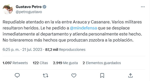 A pesar que el presidente Gustavo Petro anunció a través de su cuenta de Twitter que el ministro de defensa, Iván Velásquez estaría en el departamento de Arauca el día de hoy para liderar consejo extraordinario de seguridad tras el atentado con explosivos ocurrido en el municipio de Tame, el ministro no llegó, tal parece que la situación de orden público que vive el departamento de Arauca no le importa al gobierno central.