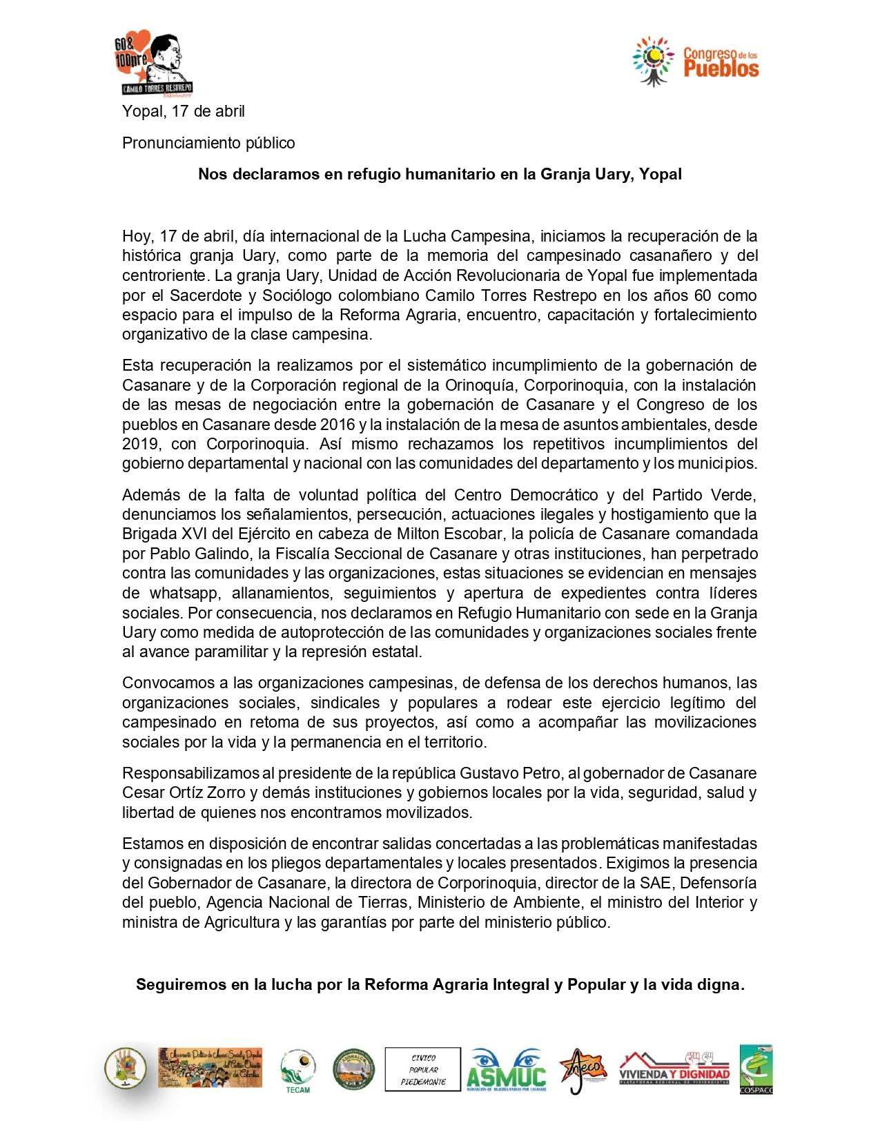 El pronunciamiento se realizó hoy 17 de abril mediante una comunicacion por escrito, en el marco del Día Internacional de la Lucha Campesina, fecha en la que también informaron el inicio de la recuperación de este predio, considerado un espacio histórico para el movimiento campesino en el departamento de Casanare.