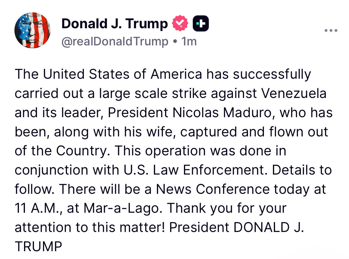 Los Estados Unidos de América han llevado a cabo con éxito un ataque a gran escala contra Venezuela y su líder, el presidente Nicolás Maduro, quien ha sido, junto con su esposa, capturado y sacado del país por vía aérea. Esta operación se realizó en conjunto con las fuerzas del orden de los Estados Unidos. Más detalles próximamente. Habrá una conferencia de prensa hoy a las 11:00 a. m. en Mar-a-Lago. ¡Gracias por su atención a este asunto!