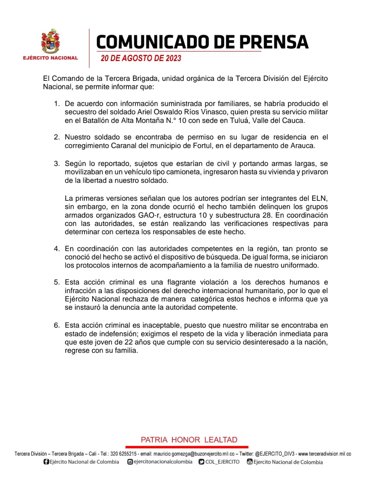 1. De acuerdo con información suministrada por familiares, se habría producido el secuestro del soldado Ariel Oswaldo Ríos Vinasco, quien presta su servicio militar en el Batallón de Alta Montaña N.° 10 con sede en Tuluá, Valle del Cauca.