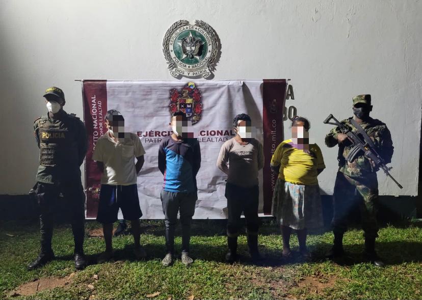 En el lugar se logró la captura en flagrancia de cuatro sujetos, por su presunta responsabilidad en el delito de tráfico, fabricación y porte de estupefacientes, así como la incautación de abundantes insumos sólidos y líquidos, además de materiales utilizados en la producción del estupefaciente, lo que afecta de manera contundente las economías ilícitas de este grupo armado organizado.
