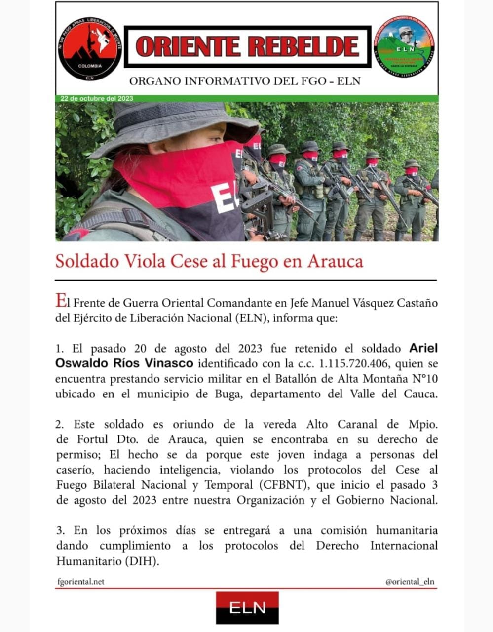 El día anterior a través de un comunicado el Ejercito Nacional confirmo el secuestro del uniformado y como presuntos responsables al ELN.