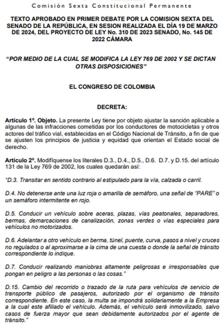 A partir de lo anterior, y una vez el proyecto se convierta en ley de la república, los motociclistas que por alguna circunstancia falten a los literales D anteriormente mencionados, no serán sancionados con la inmovilización del vehículo, pero sí deberán afrontar la multa correspondiente por la falta que es equivalente a 30 salarios mínimos legales diarios vigentes (smldv), que para 2024 es de $1.300.000.