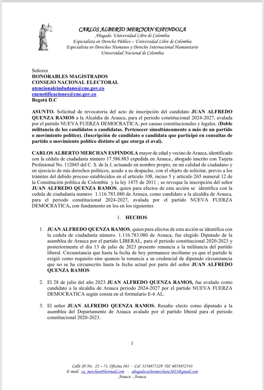 Se trata del candidato del partido Nueva Fuerza Democrática, Juan Alfredo Qüenza Ramos, la solicitud fue radicada ante el Consejo Nacional Electoral por el abogado Carlos Alberto Merchán Espíndola, quien ha demandado en repetidas ocasiones al actual diputado.