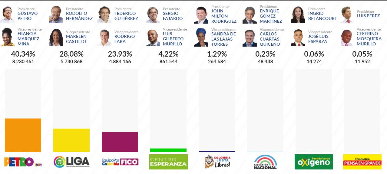 En el preconteo de la Registraduría Nacional, con el 96,1 % de las mesas informadas, Gustavo Petro tiene la ventaja con el 40,34 % equivalente a 8.230.461 del total de votos contados. Por su parte, el ingeniero, Rodolfo Hernández, tiene el 28,08 % con 5.730.868 votos.