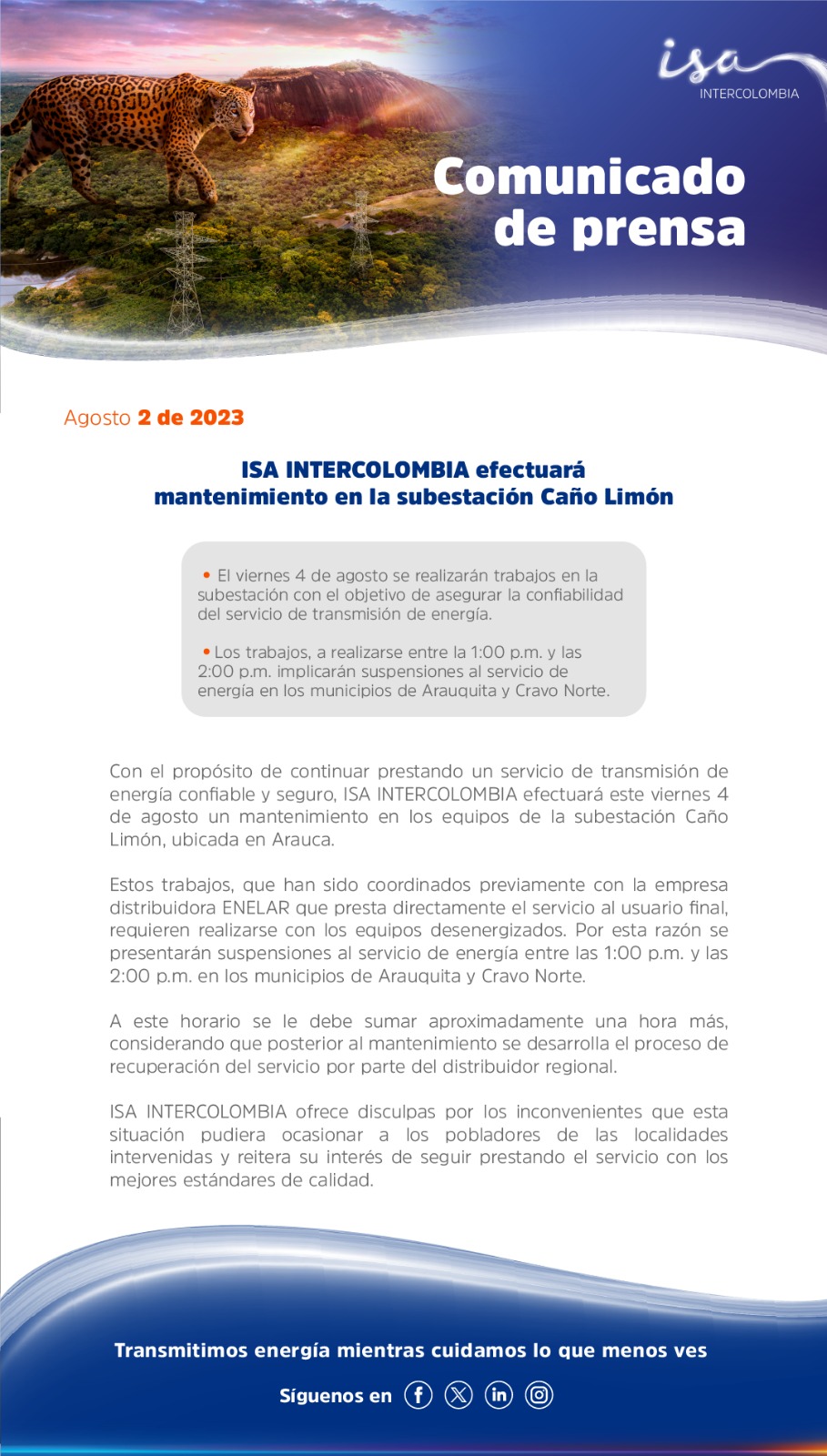 ISA INTERCOLOMBIA ofrece disculpas por los inconvenientes que esta