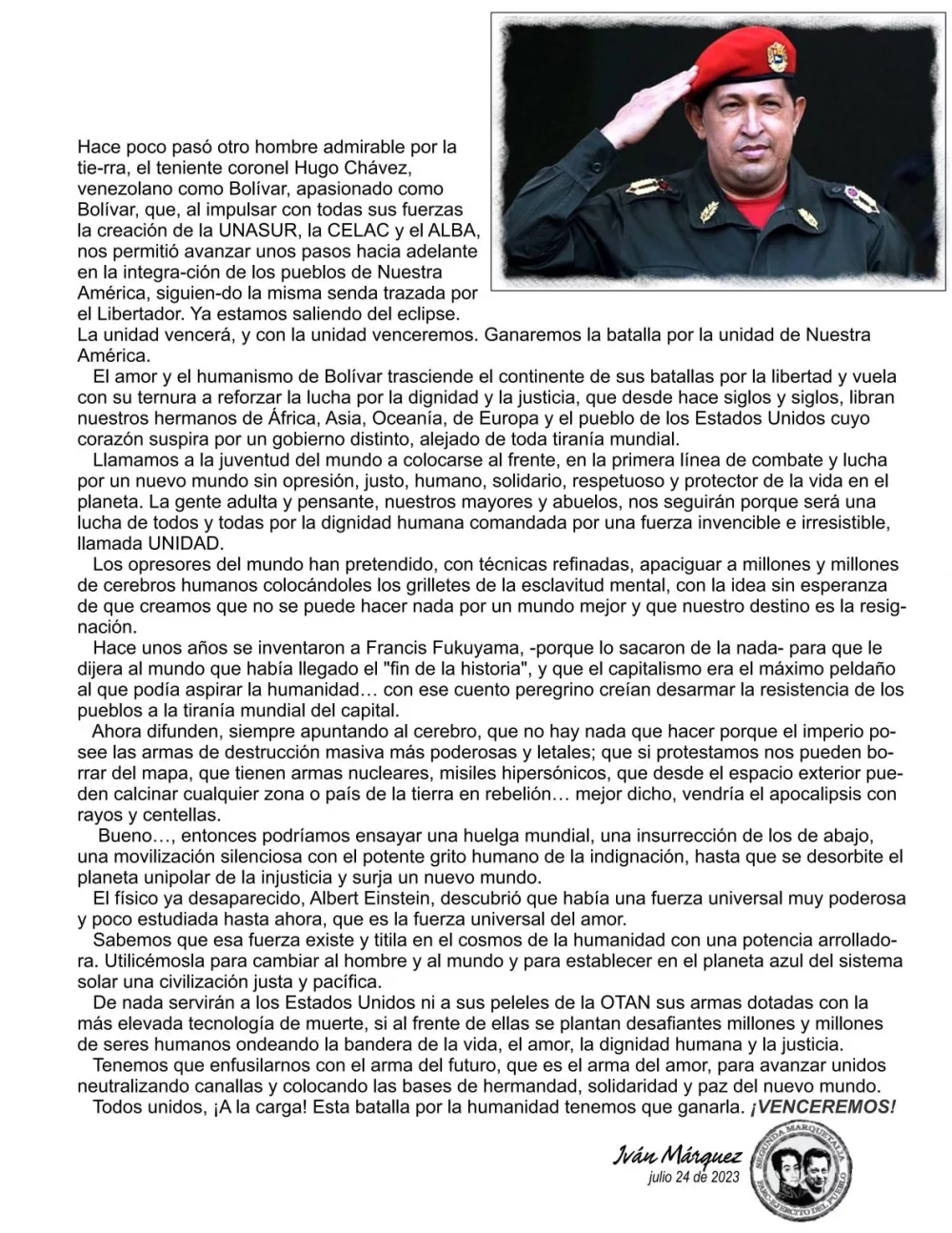 Márquez aparece firmando un documento denominado “Ideas para una visión continental”, que tiene fecha del 24 de julio de 2023. En este texto, ‘Márquez’, cuyo nombre de pila es Luciano Marín, defiende el legado del expresidente venezolano Hugo Chávez y critica fuertemente la injerencia de Estados Unidos en los asuntos de América Latina. Además, hace un llamado a la unidad continental, especialmente dirigido a los sectores progresistas.