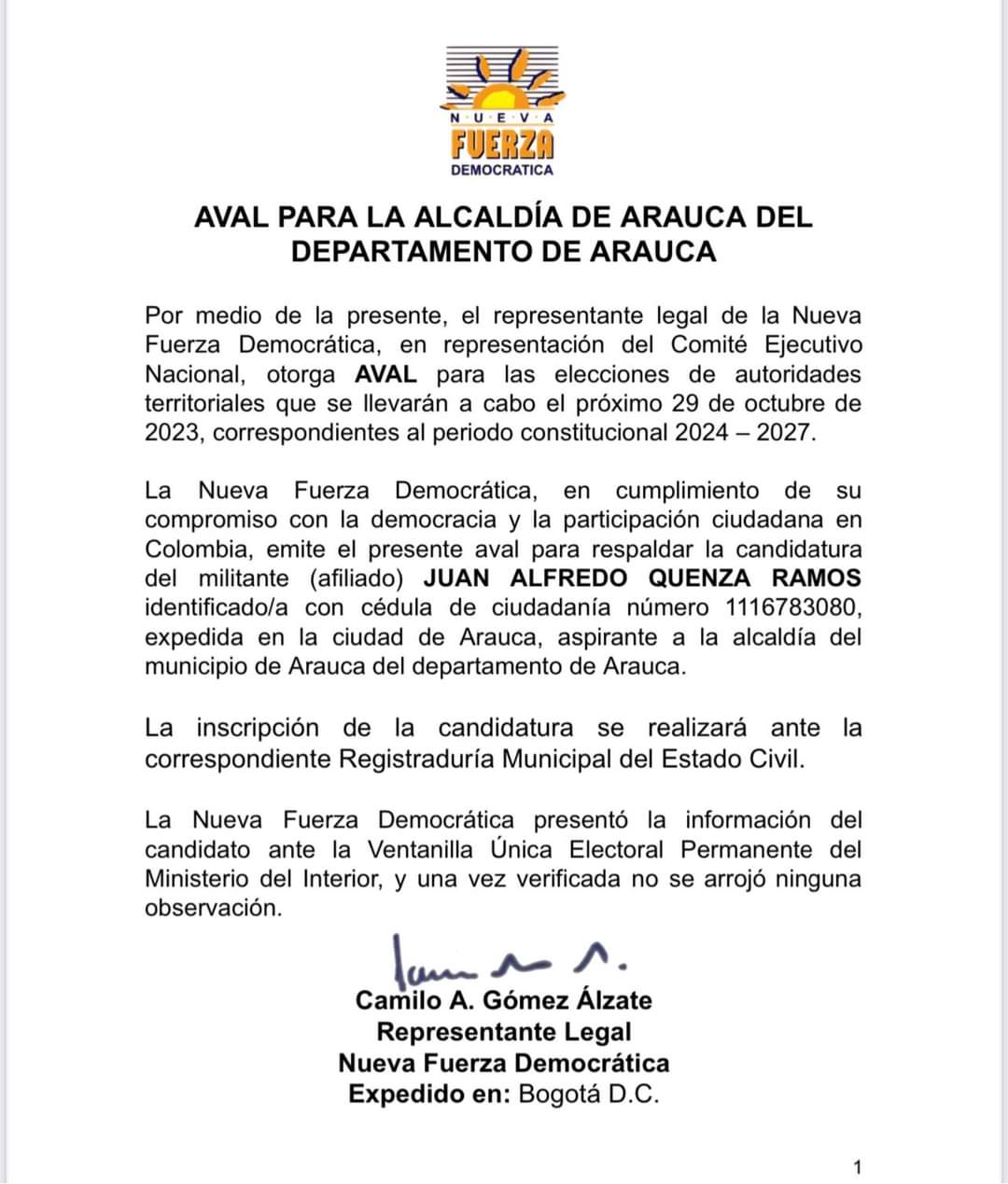 El actual diputado Juan Qüenza, quien a penas hace unos días renunció al partido Liberal Colombiano confirmo a través de redes sociales que fue avalado por el partido Nueva Fuerza Democrática del expresidente Andrés Pastrana, para aspirar a la alcaldía de Arauca.