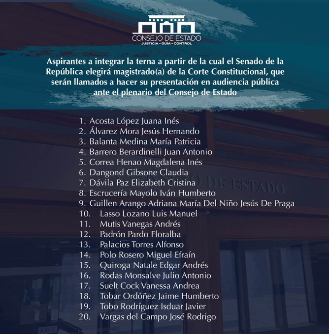 El listado está compuesto por 12 hombres y ocho mujeres, entre quienes se destacan las profesoras de Derecho Constitucional, Juana Acosta López y Magdalena Correa Henao; los exmagistrados auxiliares de la Corte Constitucional, Juan Antonio Barrero Berardinelli y Adriana Guillén Arango (también exdirectora de la Agencia Nacional de Defensa Jurídica del Estado); y el exmagistrado del Tribunal Superior de Cundinamarca, Luis Manuel Lasso Lozano.
