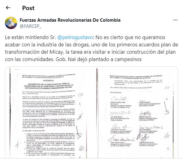 Las Farc, en esa cuenta de X, aseguran que lo que dice el primer mandatario no es verdad. “No es cierto que no queramos acabar con la industria de las drogas, uno de los primeros acuerdos plan de transformación del Micay, la tarea era visitar e iniciar construcción del plan con las comunidades. Gob. Nal dejó plantado a campesinos”, escribieron.