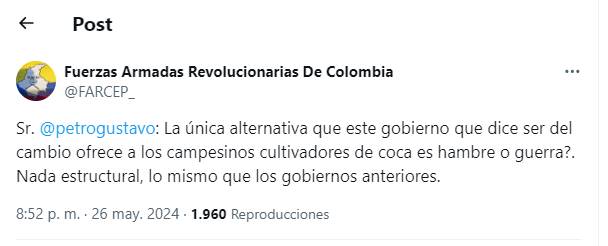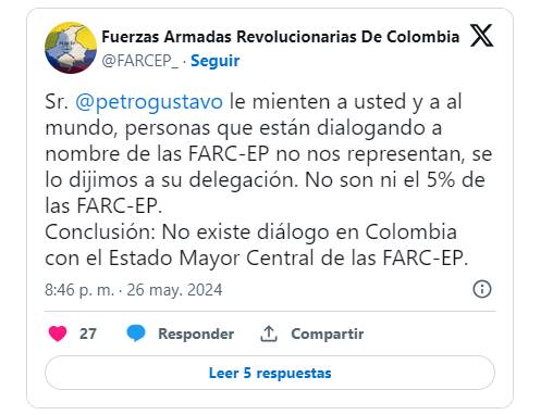 En una cuenta de X, las disidencias -que se hacen llamar FARC-EP- le responden al mandatario. Aseguran que quienes están en la mesa de diálogo no los representan.