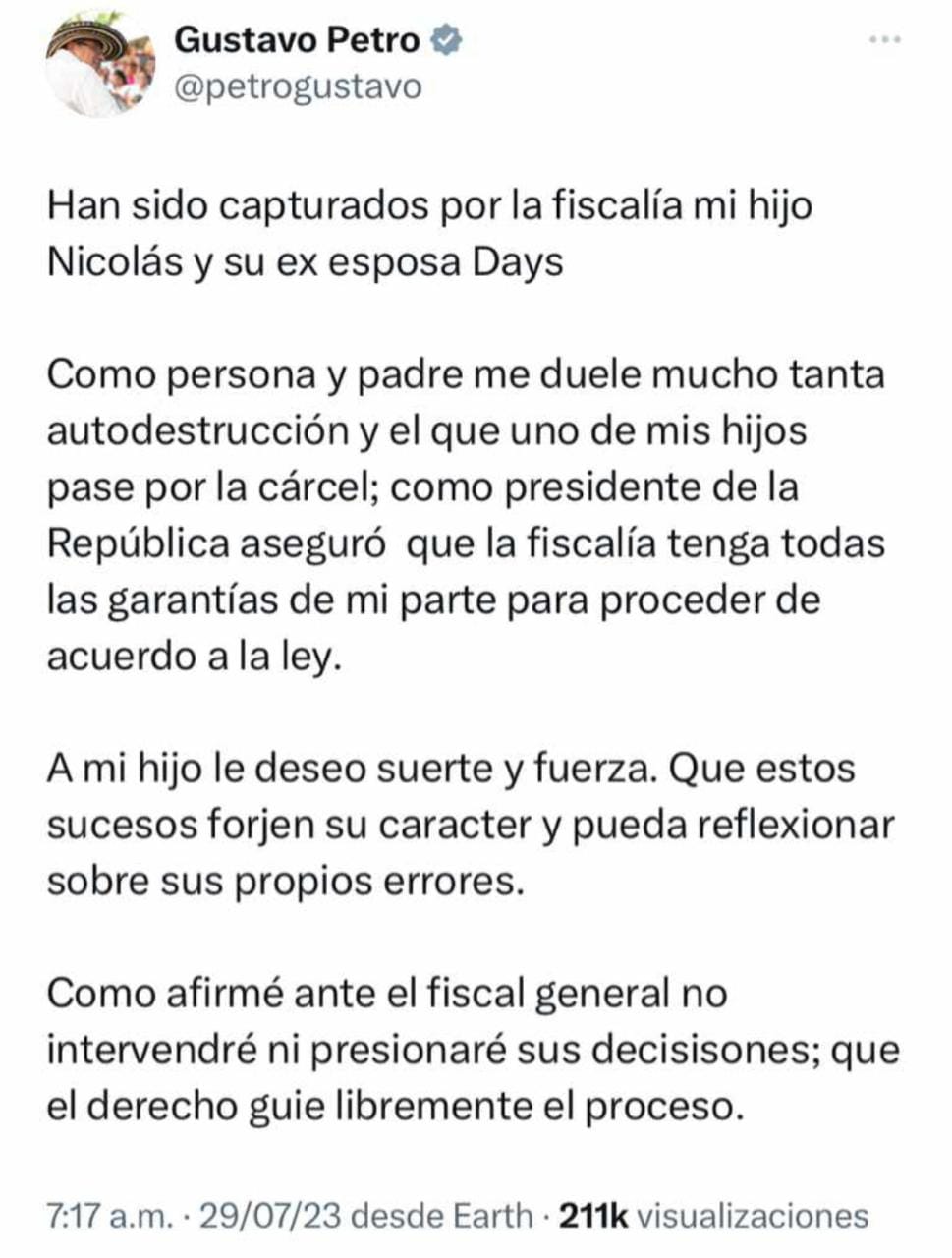 El presidente Gustavo Petro reaccionó a la noticia de la Fiscalía sobre la captura de su hijo, Nicolás Petro Burgos y su exesposa Daysuris Vásquez. A través de su cuenta de Twitter, el mandatario confirmó la noticia y dijo que, como presidente de la República, se asegurará de que la Fiscalía “tenga todas las garantías para proceder de acuerdo a la ley”.