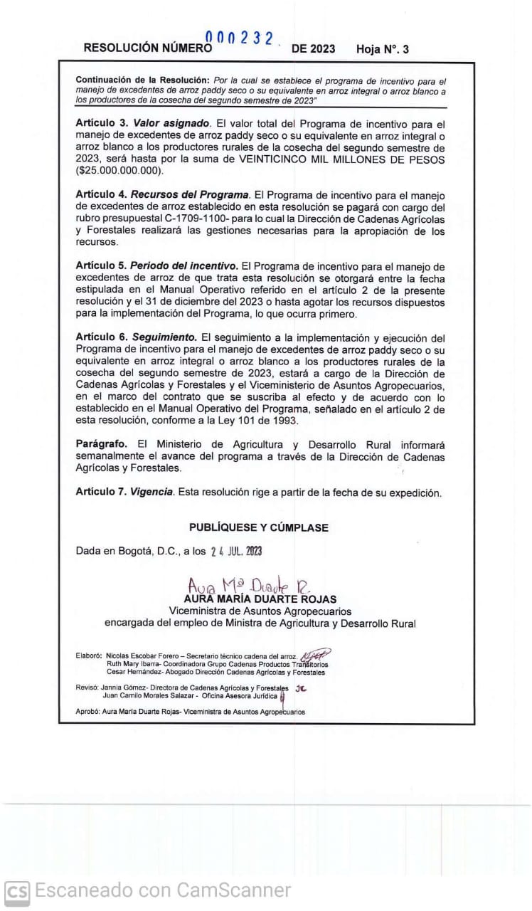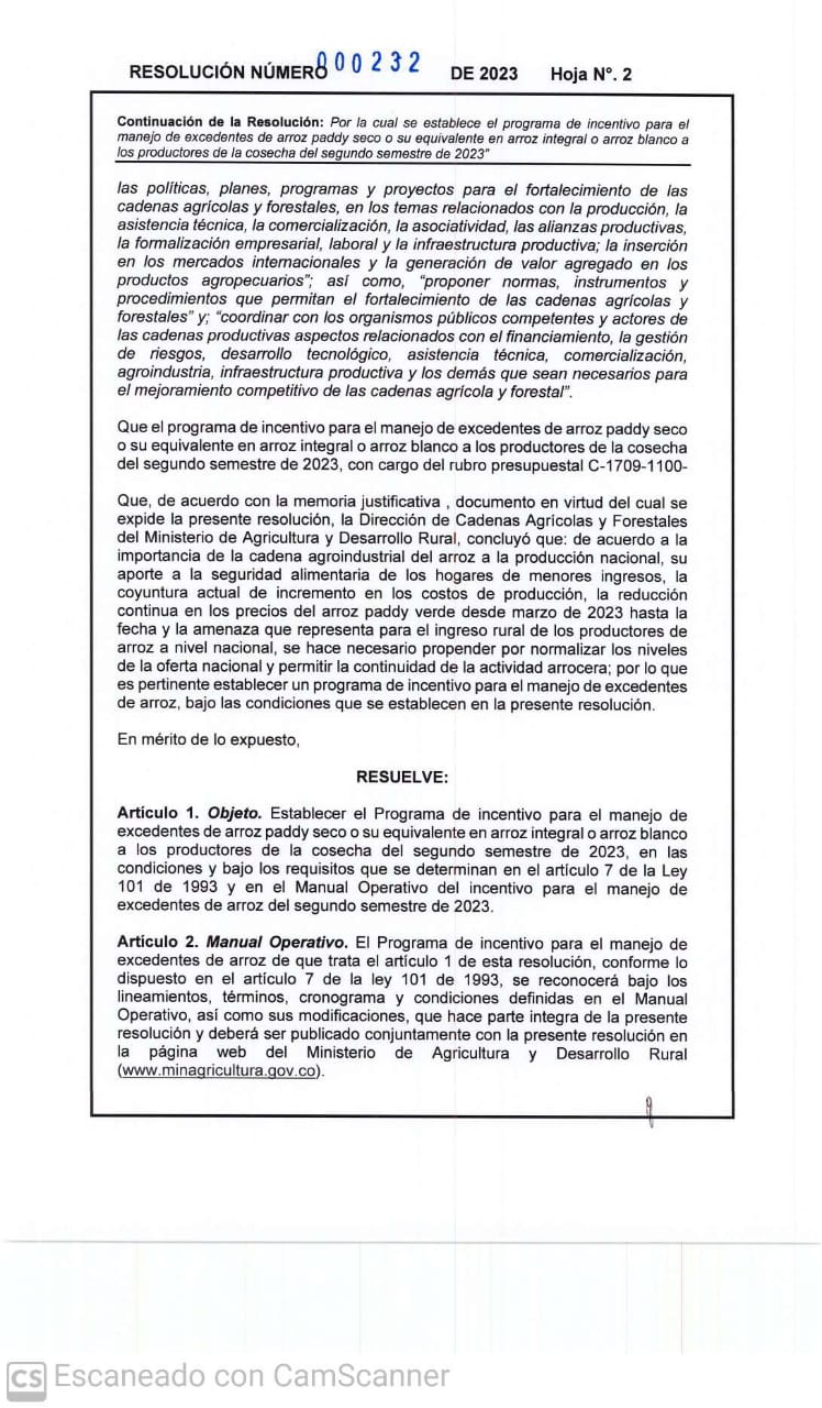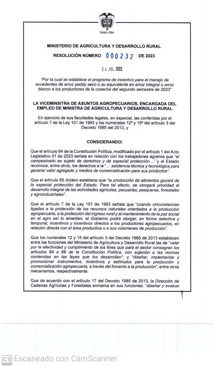 Luego de la expedición de la resolución por parte del Ministerio de Agricultura y Desarrollo Rural y que reglamenta el programa de incentivo para el manejo de los excedentes de la cosecha de arroz, el Gobierno departamental reitero su promesa de hacer seguimiento a los compromisos adquiridos.