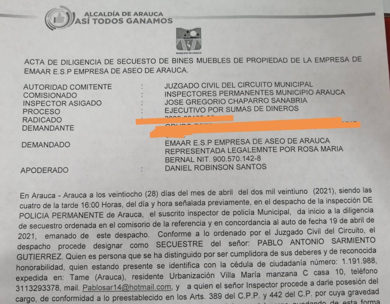 De la diligencia se pudo conocer que se realizó por el inspector de policía, y los pocos bienes a nombre de la empresa que se encontraban en el relleno sanitario las Garzas, fueron retenidos mientras la gerente cancela las obligaciones que superan los 6 mil 400 millones de pesos.