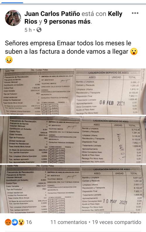 Pero los concejales equivocadamente citan al recinto a la gerente de EMAAR, le tienden tapete rojo y le agradecen por su excelente trabajo, al punto que pareciera que el concejal Palencia fuera el jefe de prensa de la empresa, lo vemos en redes sociales haciendo alarde cuando EMAAR hace el trabajo que tiene que hacer y por el cual cobra en su factura, pues las limpiezas de los parques y las fulanas labores sociales NO son gratis. Si se hace un análisis y se compara la factura en junio de 2021 para estrato 1 era de 21.613 y en la actualidad tiene un valor de 23.759, lo que significa que en menos de un año y en plena pandemia hubo un incremento del 10%, pero los concejales no hacen mención al tema y se hacen los locos.